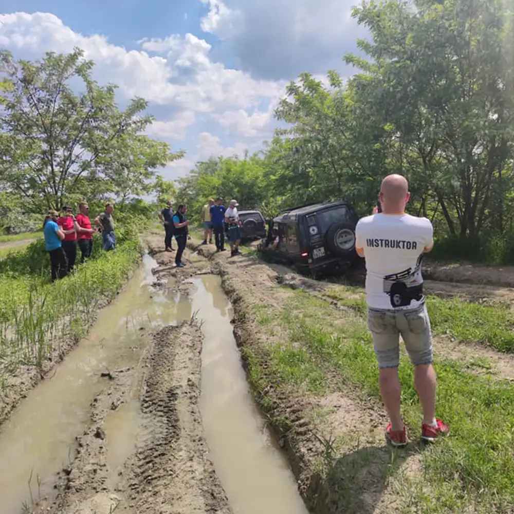 Każde szkolenie zaczynamy od teorii, która zawiera: ogólną budowę samochodu terenowego, działanie mechanizmów przenoszących napęd, rodzaje napędów i ich działanie, działanie reduktora, dobór odpowiednich opon do rodzaju terenu, zasady bezpiecznej jazdy w terenie. Po tym wstępie przechodzimy do jazdy w terenie. Będziesz mógł/mogła poczuć kontrolę nad samochodem w najtrudniejszych warunkach. Część praktyczna zawiera: naukę czytania drogi, kontrolę nad trakcją w terenie, pokonywaniem przeszkód błotno-wodnych, wjazdy i zjazdy ze wzniesień, technikę jazdy w głębokich koleinach, pracę z wyciągarką oraz zastosowanie zasad bezpiecznej jazdy offroad.